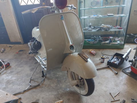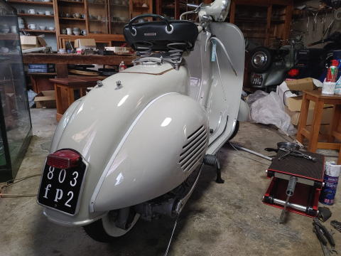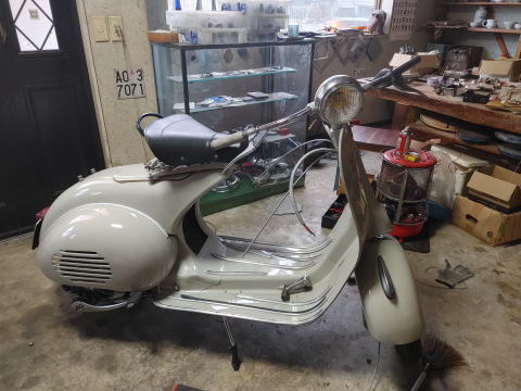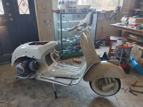 1955年式ACMA V55 オリジナルの上からぼかし塗装をしていたのでレストアベースとして最高の車両でした。 全塗装、エンジンオーバーホール、細部までこだわってフルレストアしています。 コンクールコンデションのベスパです。
